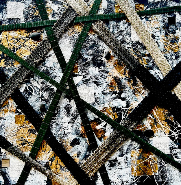 Mixed Media: Black, white, gold leaf painting with fabric weaving, stones, mirrors